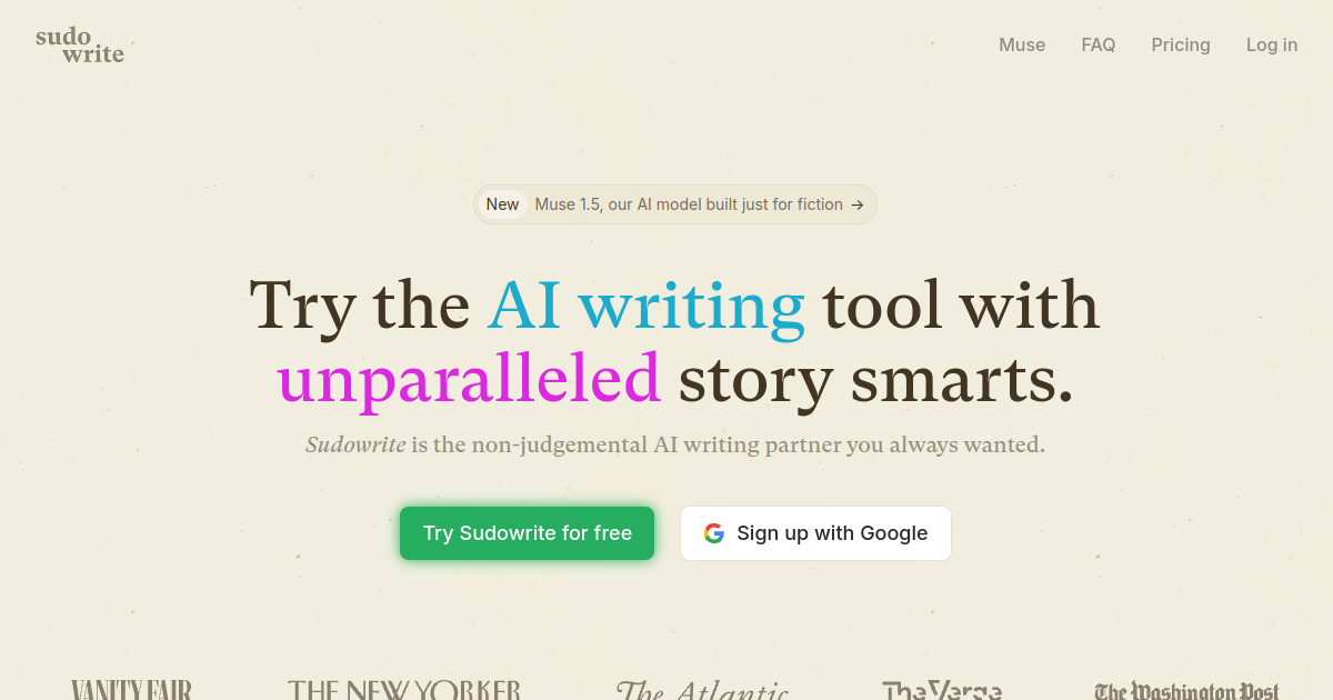 The AI writing tool built specifically for fiction writers. Helps with plot brainstorming, character development, writing descriptions, and pushing through writer's block — trained on great literature.