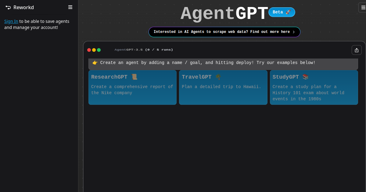 Autonomous AI agents in your browser. Assign a goal and AgentGPT deploys an AI agent that browses the web, runs tasks, and reports back — no technical setup required.