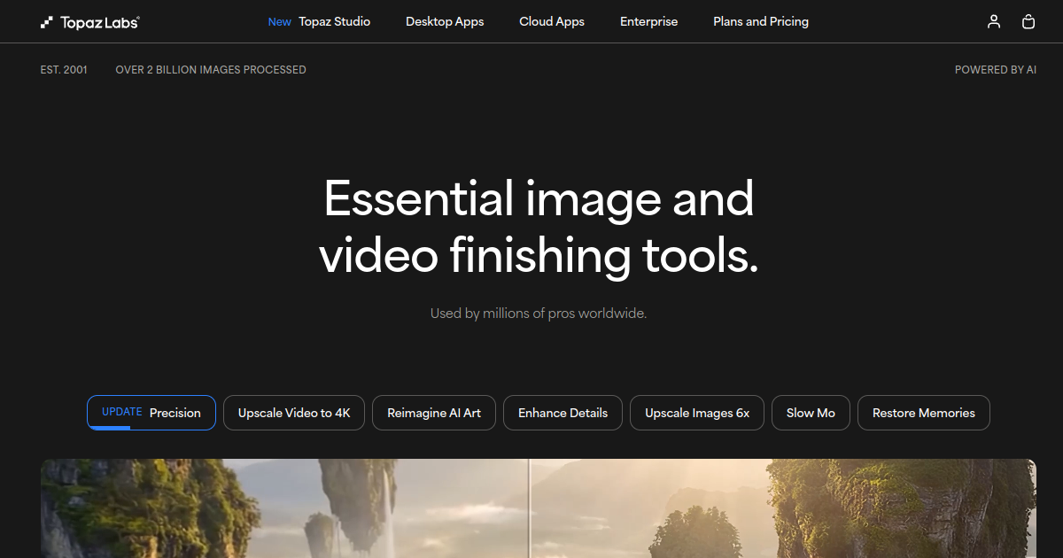 AI-powered photo enhancement suite by Topaz Labs. Upscale images up to 6x with jaw-dropping detail, remove noise, sharpen blur, and recover old photos — all powered by dedicated AI models.