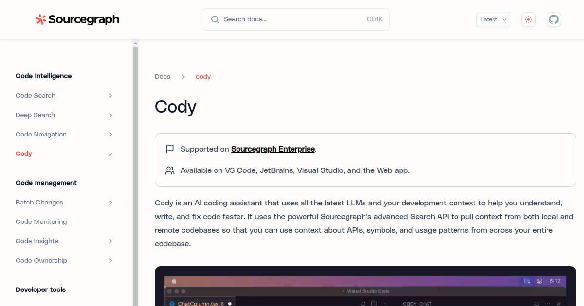 AI coding assistant with deep codebase context. Unlike Copilot, Cody reads your entire repository and answers questions about any file, function, or system in your codebase.
