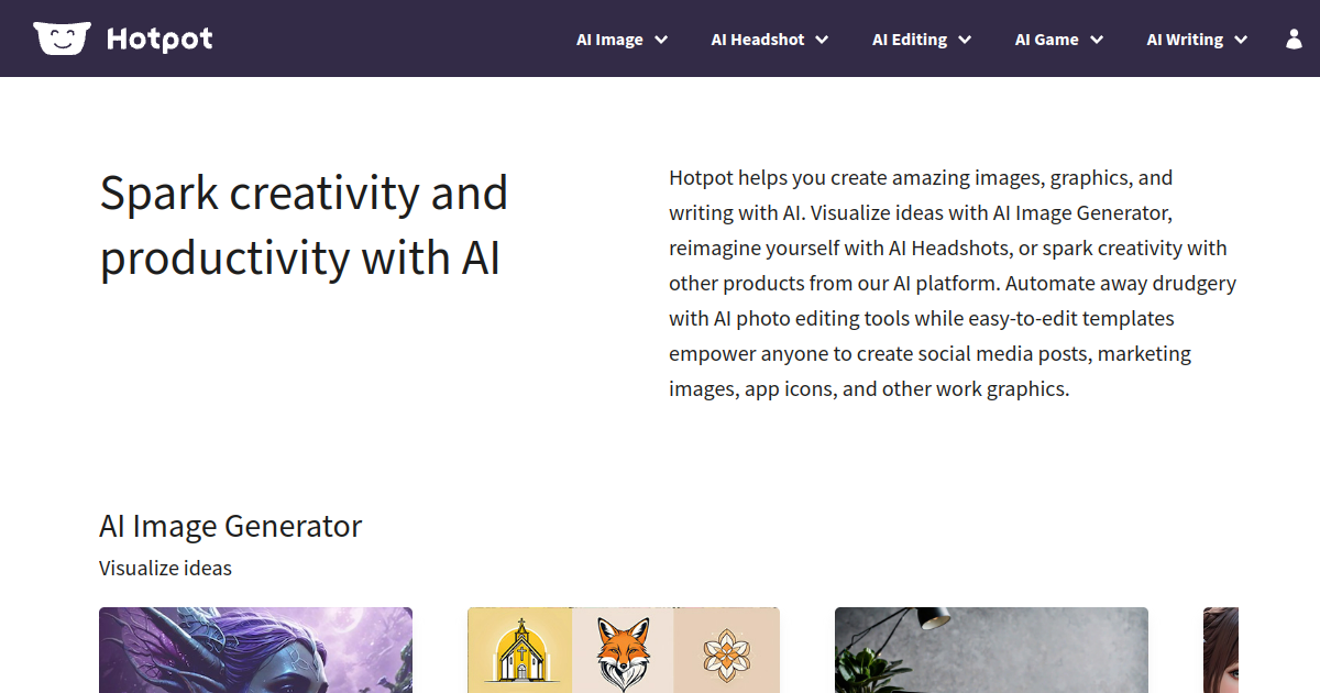 Suite of AI image tools including art generator, background remover, image resizer, and AI headshots. Clean interface with generous free tier — perfect for non-technical creators.